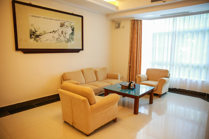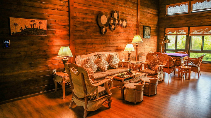 进入木屋正门,首先看到的是一个非常宽敞的客厅,客厅里有沙发,茶几,茶具齐全,还有一台麻将机,供住客消遣。