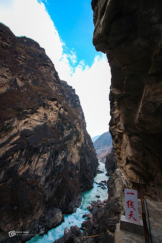 TINA'S的面包车将我们免费拉到中虎跳的徒步入口。其实也就五分钟的距离。 然后:小伙子,要下去,收费十元! 被一个凶神恶煞的大妈拦住。 震惊。边上一块牌子上大概写着:中虎跳是当地村民自己出财力物力打造的,收取十元维护费,他们维护也辛苦,请谅解,主修建人:XXX,!(&*&*~~~~~~。 前面昨天那两“美国夫妻”对看两眼,也没说话,交了钱就走了。估计是看大妈眼神凶恶,被吓到了。 行吧,暂且体谅下你们。居然还给了张手写凭证:中虎跳一线天10元。~~