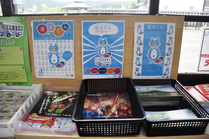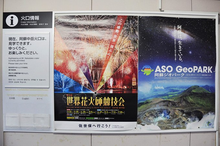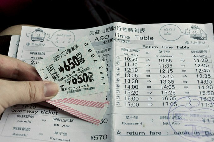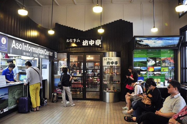 阿苏站的门口就是前往阿苏火山的巴士站· 在售票处买好票后等车出发,单程650日元,有准确的时刻表可供查询~