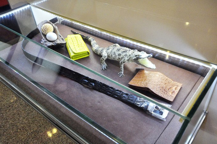 皮革展示中心出售以泰国鳄鱼皮、珍珠鱼皮和大象皮为材料而制成的各类皮制品,其中以鳄鱼皮最为昂贵· 不过看着被摆成各种姿势的鳄鱼标本,特别是作合十礼脸带微笑的鳄鱼一家三口,突然有一种相当讽刺的意味~
