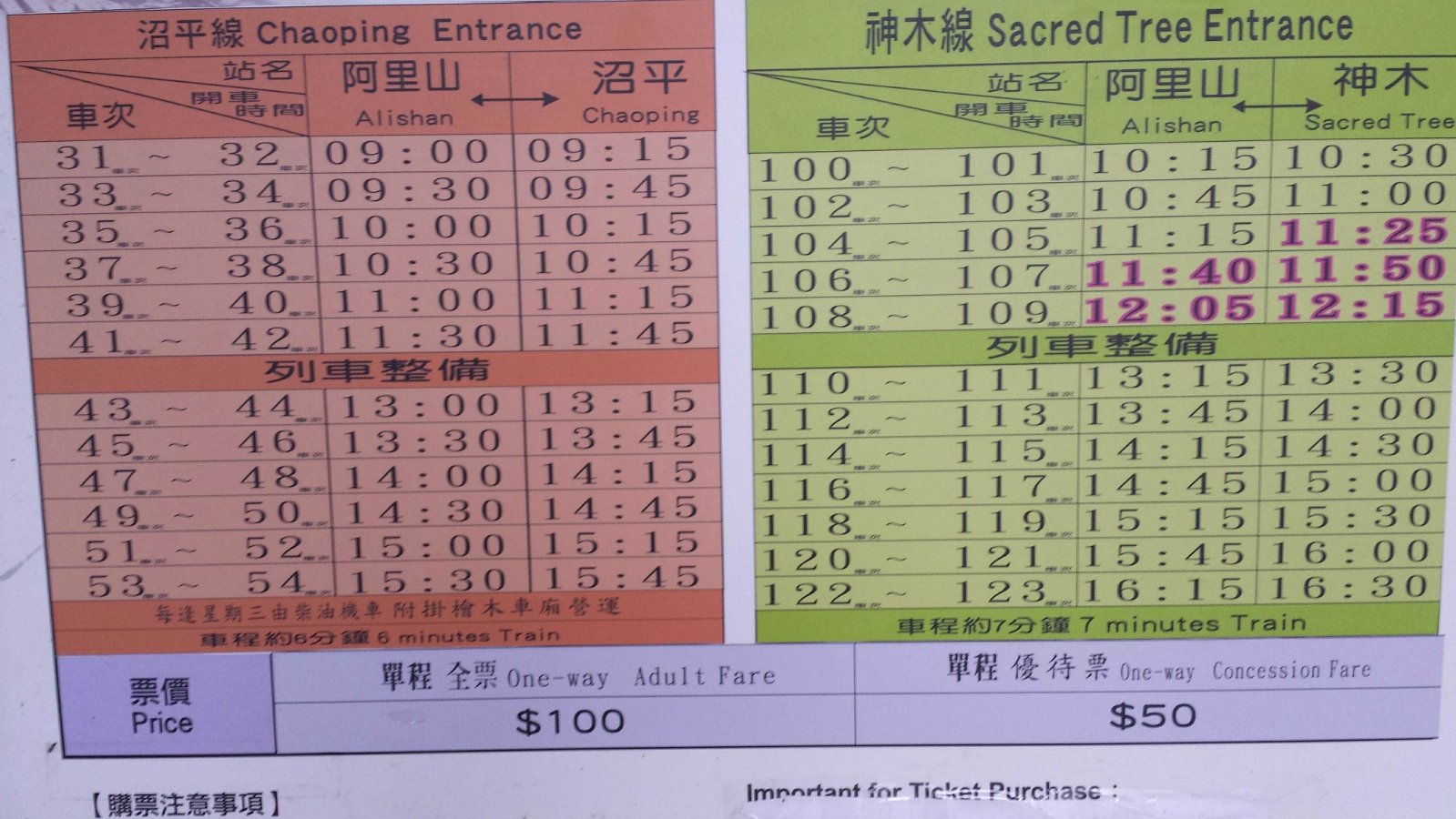 车站外的公示牌写的很清楚,票价、路程及注意事项都标示完整清晰。停靠在车站的阿里山小火车