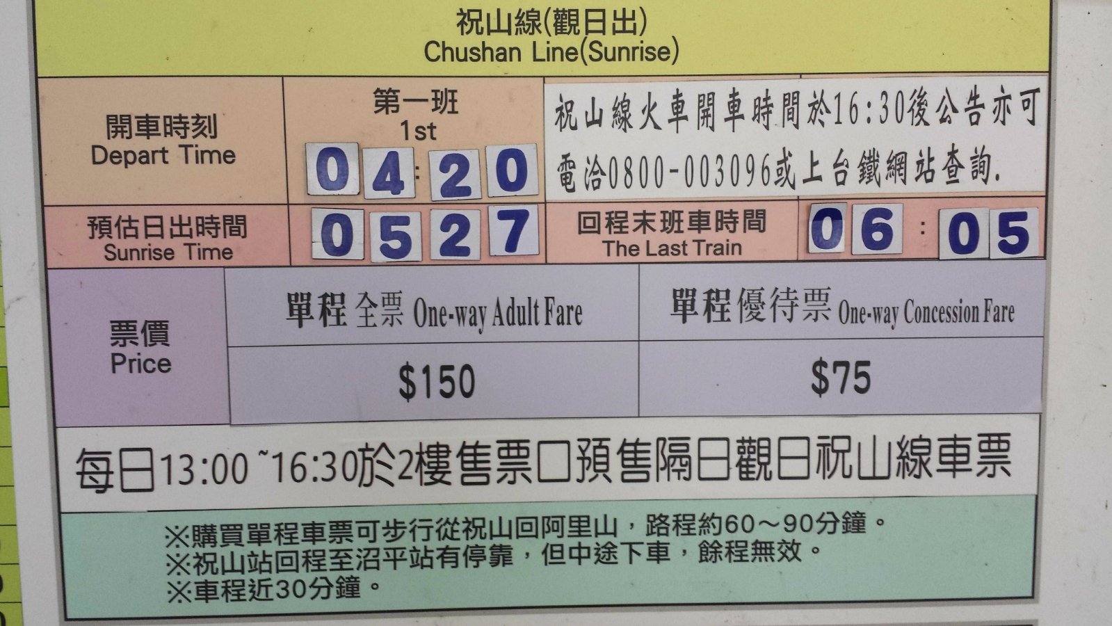 1.祝山车站位于海拔最高处,看日出的最佳地点。而祝山线火车班次一般都很早就开,然后6点左右基本就停开了,所以想坐小火车上山的游客一定要注意时间。搭乘阿里山小火车到祝山车站单程一人150NT,如果中途从沼平车站下车了,那么很抱歉,再上车到祝山车站要另交150NT,跟地铁不一样。