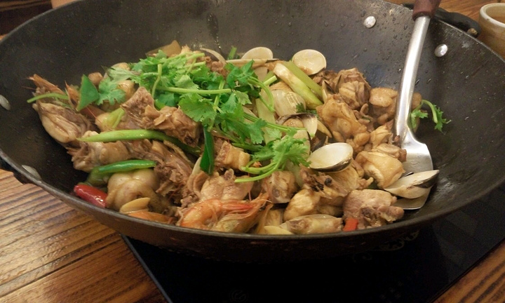 味道是不错的,环境也是比较干净,一锅鸡里面有虾,白贝,足够4个人吃。