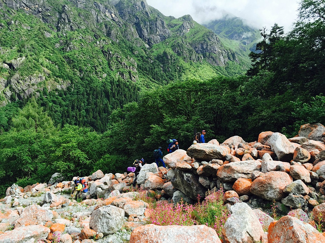 要坚信,道阻且长,行则将至;不要怕,黑夜虽长,还有明天。 8月1日,今天的目标是到达C1营地。早上六点多就醒了,老徐已经快要做好了早餐,背夫也早早到了营地。吃过早饭,打包好行李,便开始出发。临行前,老徐悄悄的塞给我两个煮鸡蛋,道了一声:生日快乐!我自己都差点忘了的生日,老徐居然还记得,简直感动!C1营地海拔4400M,距上海子大约十多公里路程,上升海拔近1000M,道路崎岖,需要横跨河谷、穿越丛林、翻越陡坡,路程是艰辛的,但风景是美好的。越向上,脚步越沉重,行走越困难,但向上的每一步,都愈加坚定;看到的每一处,都风景甚好。中午,行至半程,大伙儿停下来补给(活动安排中今天的午餐为路餐),我拿出老徐送我的鸡蛋,跟军军一人一个(好兄弟,当然有福同享啦),这应该是最值得纪念的生日蛋了。 刚吃完东西,协会传来一个消息,雀儿山(主峰海拔6168M)一登山者因严重高反仍坚持冲顶导致身亡的消息。我突然反应过来,从成都出发时,我的一个大学兄弟正好发了朋友圈要去攀登雀儿山,担心!下午三点,翻过一个挂有经幡的垭口,爬过一个几十米的山坡,终于到达C1营地。营地出奇的平坦,像是长年的雪水和落石冲集而成的一个平原,大概有四五个标准足球场那么大。扎好营后,大概是走的太快、喝水太少的缘故,突然开始头疼,且愈加厉害,感觉庚即会炸裂,爆想睡觉却不能睡。老徐和军军筹备晚餐,我只能干坐着,心里想着明天到了C2会是怎样。晚饭后,收到了来自雀儿山的报平安,好兄弟一切安好,心底终于放下了一块石头。 当晚很难入睡,头疼欲裂,索性穿上羽绒服钻出帐篷,看着漫天星空,想着陈年往事。一路走来,遇到太多的事,遇见太多的人。说实话,遇难的两位山友,给我心里造成了很大的冲击。在大自然面前,生命显得非常的渺小和脆弱。很多人说,登山的人是no zuo no die。但我想说,不登高山,不知天之高也。 他人笑我太疯癫,我笑他人看不穿!要相信,黑夜终将过去,黎明必定到来。