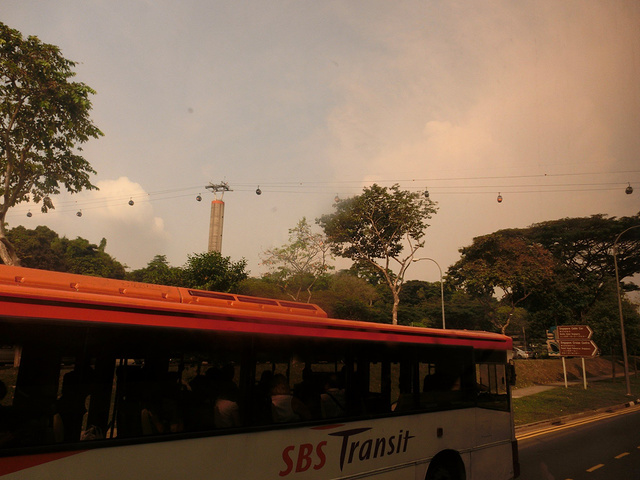 从花芭山到圣淘沙的缆车很长, 在市区内都可以看到这条缆车线。 我们是坐旅游大巴前往圣淘沙。