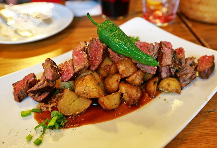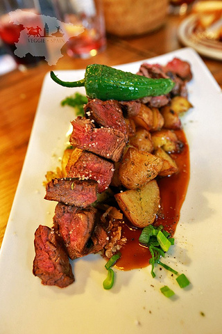 最后一道是我点菜从没失手过的牛排 西班牙的牛排做法不是又大又横的一大块 基本上没家餐厅都会把大块的肉分割开来 这家餐厅牛排块的大小适中一口一个 牛排内里还是红红的肉色吃起来口感和熟度都是刚刚刚刚好 这一盘子铺在下面的土豆烤的也是太好吃了 连最上面的一颗辣椒的味道我都还是记忆犹新 真心佩服餐厅主厨的想象力!!!!!