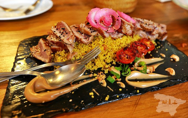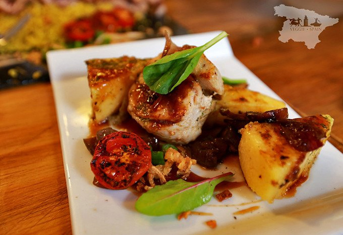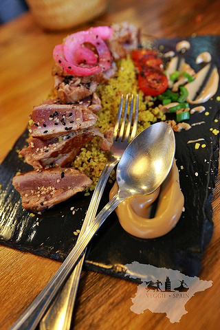 金枪鱼主菜 烤的实在是太好了 外焦里嫩每一口都在挑战我们的味蕾 下面配的小米饭微微烤过的小番茄 当然还有出色的酱料 实在 要感叹西班牙人真的太会做饭了!!!!!! 美味极了