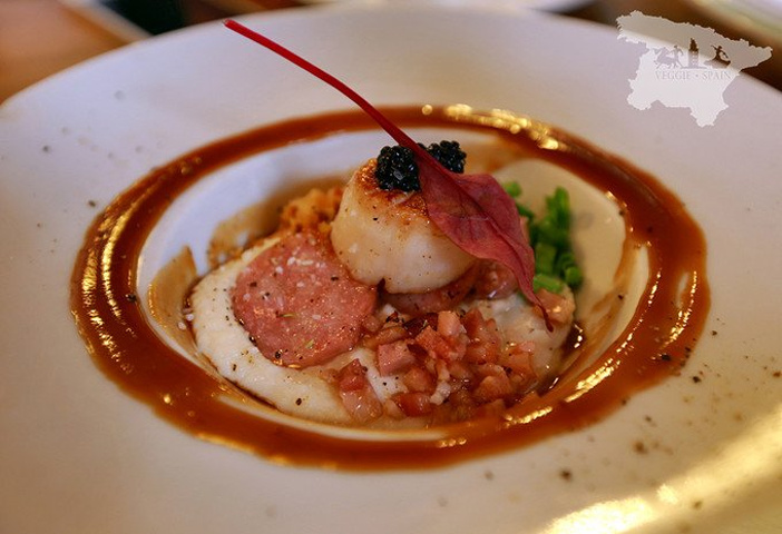 扇贝主菜 作为一只扇贝爱好者 这一道菜赢在了造型和调味 食材自然不必说西班牙靠海所有的海鲜食材都是一等一的新鲜 盘子里是搭配的很特别的培根、鱼子和面糊糊 盘子边缘刷上的一圈酱汁真是太特别了 给这道菜的造型和味道都加了不少分