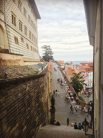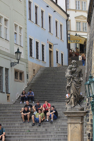 我们住的UKK酒店就在城堡脚下,这里的好处就是想去山上随时可以去。酒店后面的台阶上,经常有帅哥和美女坐着休息。蓝色的房子就是我们的酒店,仅有30间客房,小巧而精致。从我们房间的窗子望出去,斜坡的尽头就是布拉格城堡的入口。