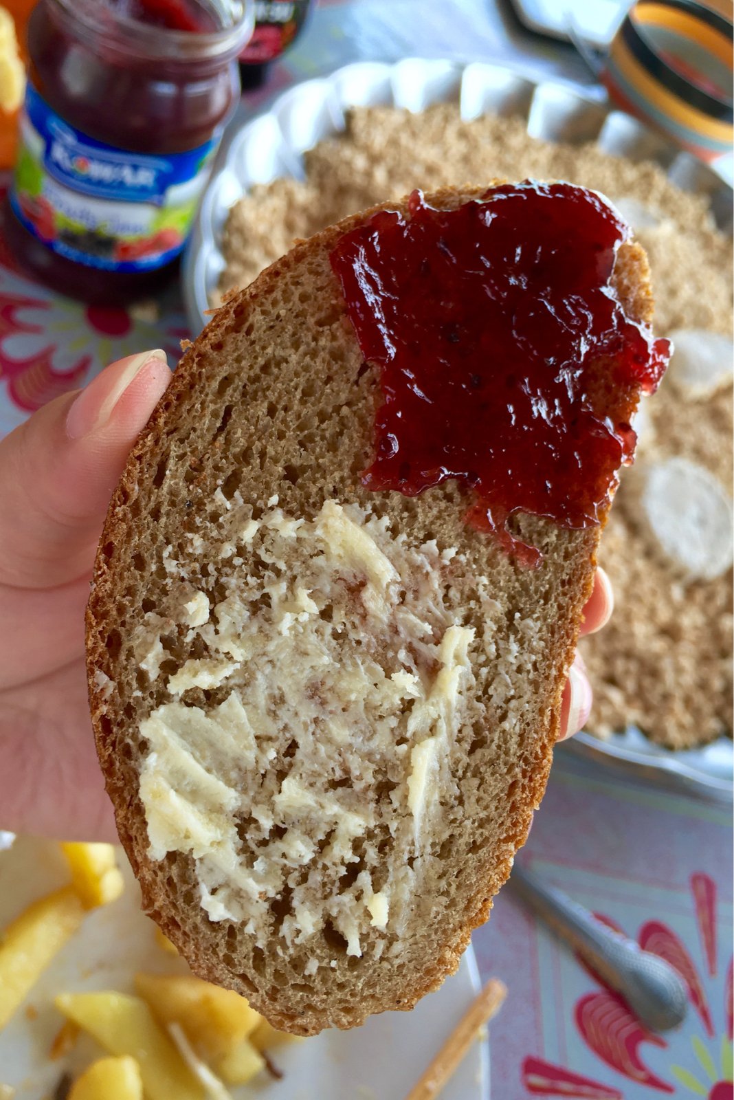 还有煎火腿蛋,俄式面包,面包上面涂的是奶酪和野草莓酱。