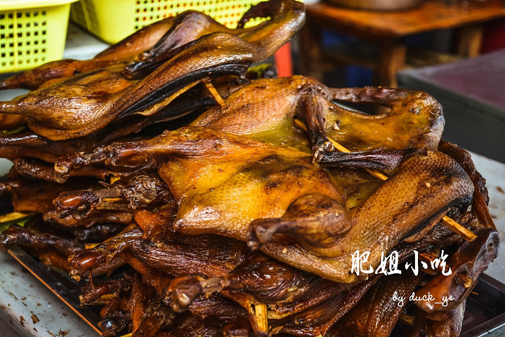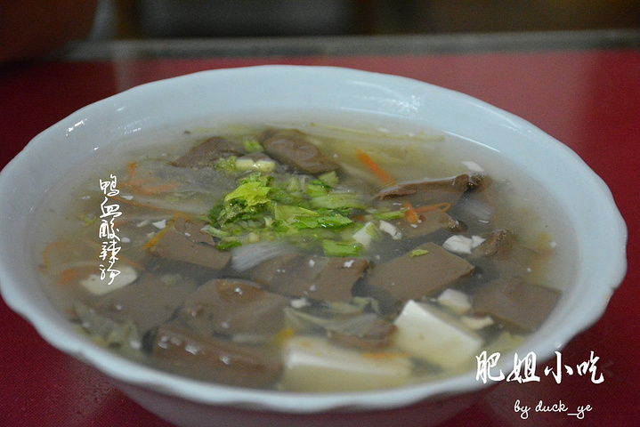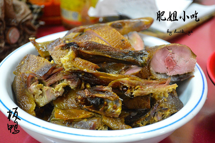 盛名必有其道理,临行前也有朋友告诫不要去吃那些出名的店铺,但是对于不熟悉的人来说,觉得还是跟着名声走会比较好。肥姐据说已经开了20多年了,店面就在索桥旁边,下午经过的时候看到板鸭就已经忍不住心动,晚上还是来拔草了。 烫嘴豆腐,5元/份,说白了就是豆腐汤,加入了黄花菜等配料,汤很鲜甜,豆腐极其嫩。 鲜蛋牛肉汤,10元/份。偏咸了一点。 酸辣鸭血汤,5元/份。最爱的是这道,酸辣口感,很是开胃。 夏茂面,5元/份,比起我们常吃的沙县拌面,夏茂面更粗一些,面同样很劲道,拌上花生酱等,分量也很大。 板鸭,45元/只,很大一只,口味比熏鸭更淡一些,很合我胃口,色泽黄润、肉香味美,咸淡适中,清香不腻。