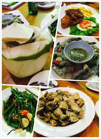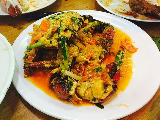 也非常好吃!图是咖喱蟹,好好吃啊!另外还有猪排、鲜虾刺身、烤生蚝和空心菜(泰国的空心菜太好吃了