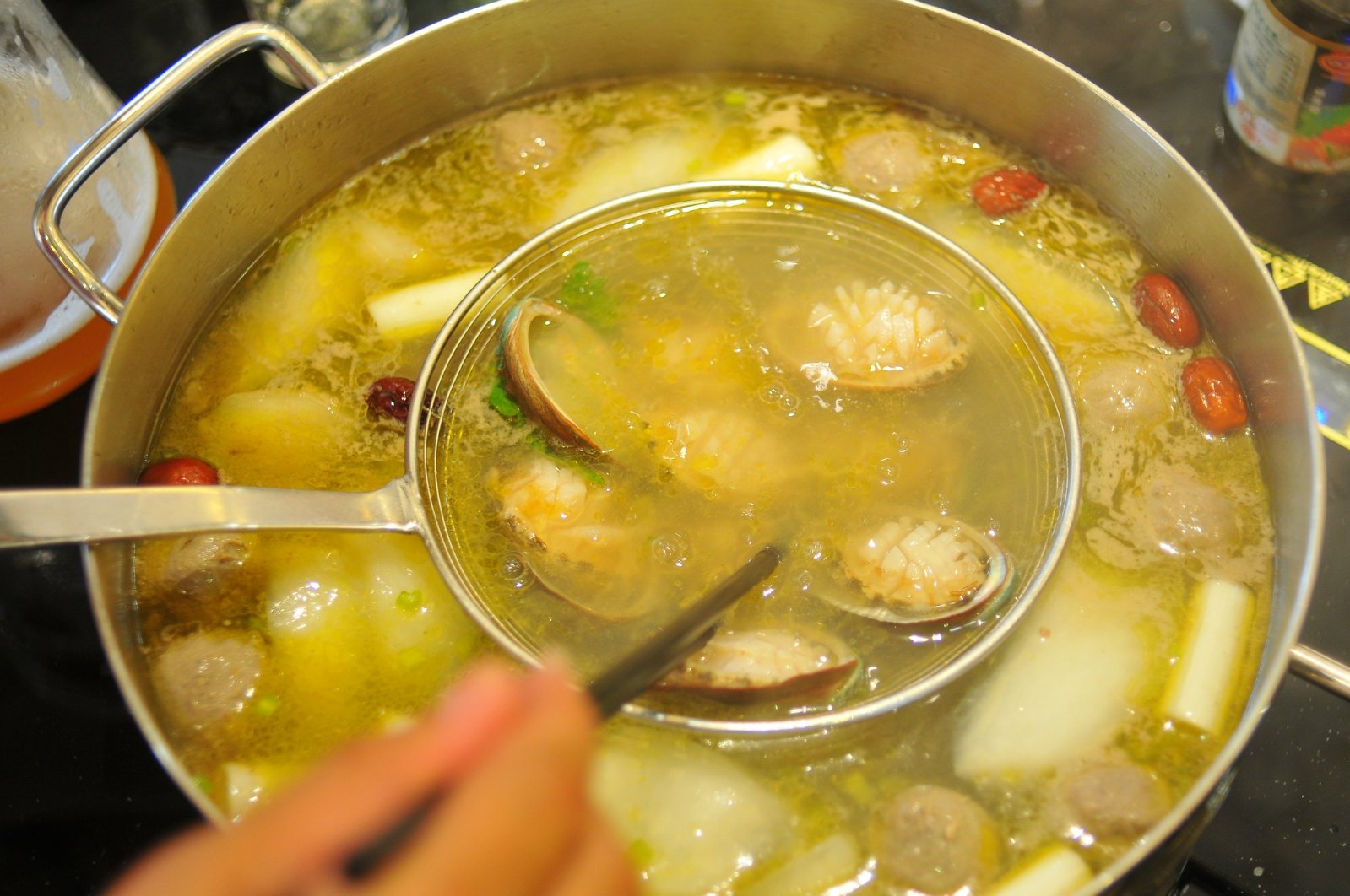 海鲜、牛肉吃完,还有手牛肉丸和手工温州鱼饼及豆油皮冬瓜娃娃菜土豆等其它配菜,最后再倒入热干面煮熟。尽管此时,我们每位客人都有饱意,但一碗饱含牛骨海鲜汤汁的面条仍是抗拒不了,三两筷下肚,情不自禁连呼好吃好吃。