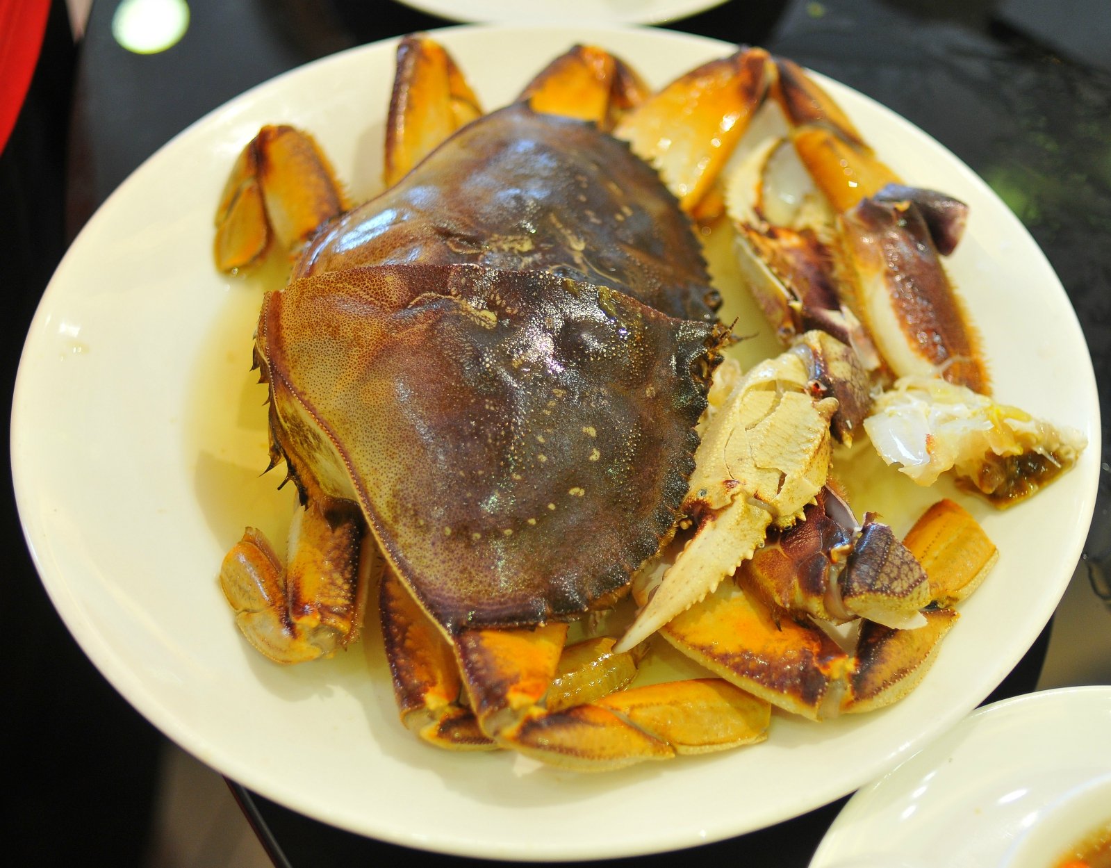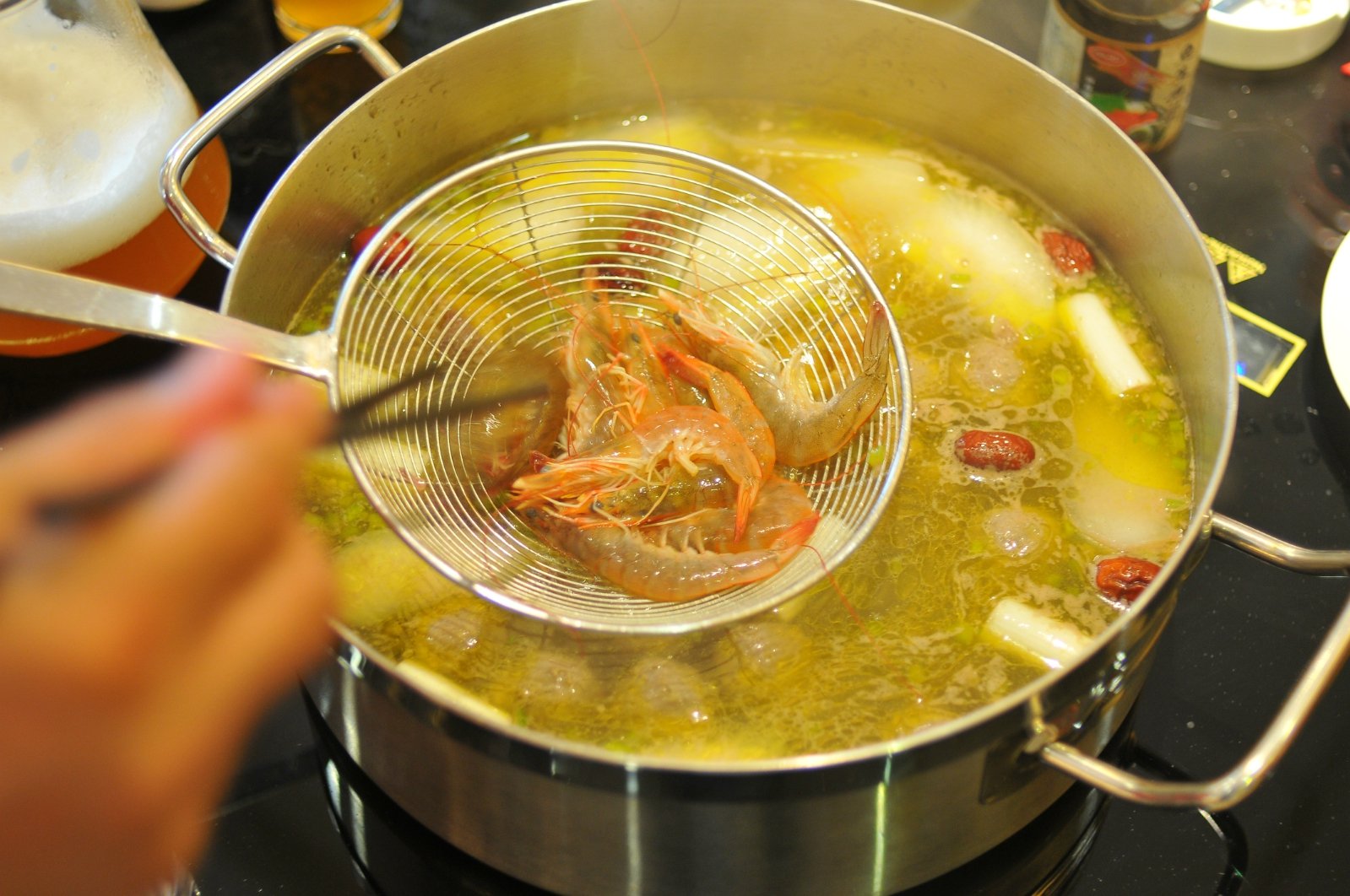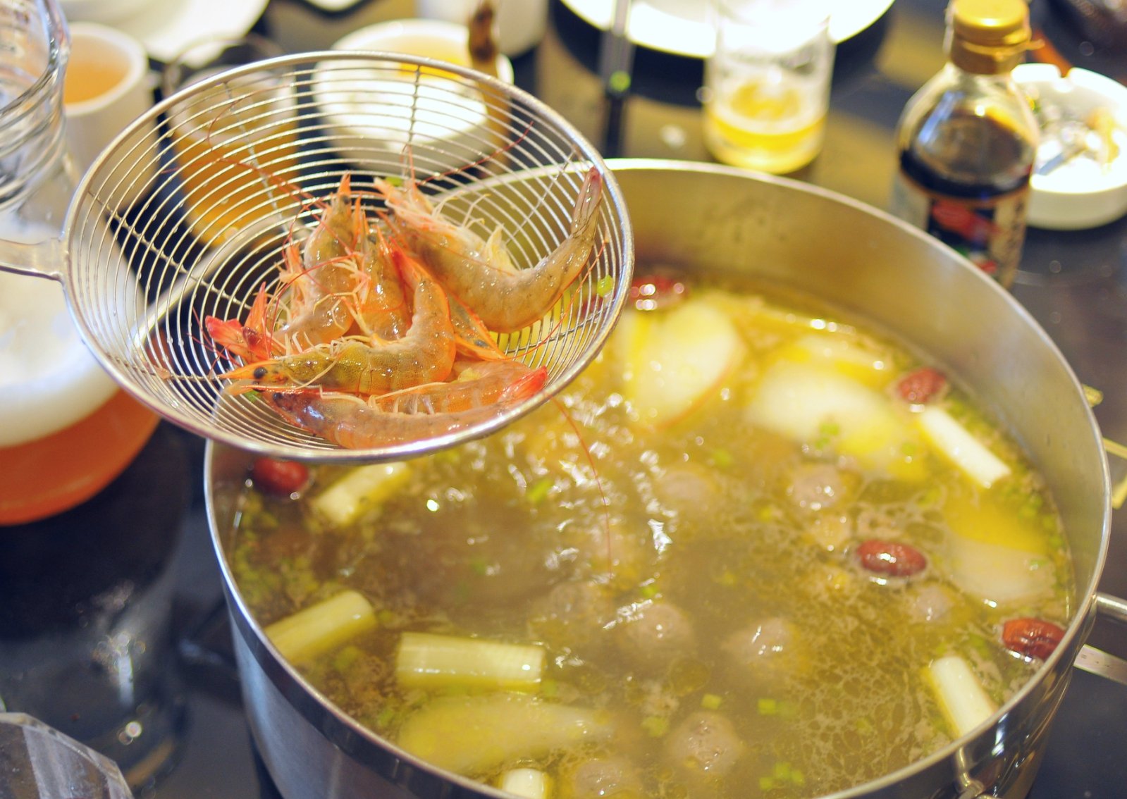 这时,服务员首先将8只活大连鲍鱼和一只活波斯顿龙虾倒入汤中,几分钟后,汤底翻滚开来,鲍鱼和波斯顿龙虾就能捞起,放入事先用小米辣、香菜、蒜泥、黄咖喱、日本芥茉酱油调好的蘸料里,既能尝到鲍鱼和蟹肉的鲜甜,又有多层次的味觉体验,咸、鲜、香、辣,层层递进,却不过分,味型上拿捏得很准。