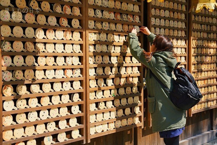 因为河合神社的“日本第一美丽社”称号,这里的绘马也格外与众不同。 所谓绘马,是日本人许愿的一种方式。在一块小木板上写上自己的愿望,供在神社中,希望神都帮助自己达成心愿。 比如这张图片,就是下鸭神社中,人们供奉的绘马。