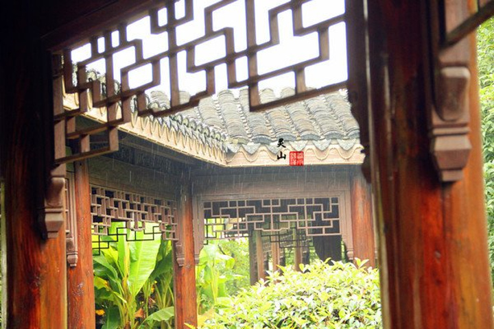 灵山蔬食馆里用餐等雨停, 一碗素面,一笼素包。 屋檐下雨水串成珠帘。我们望着窗外发呆。 素简光阴,如此寂寞美好。 那一时刻,心中透亮,仿佛雨打后的山林,片片叶子都闪着光。