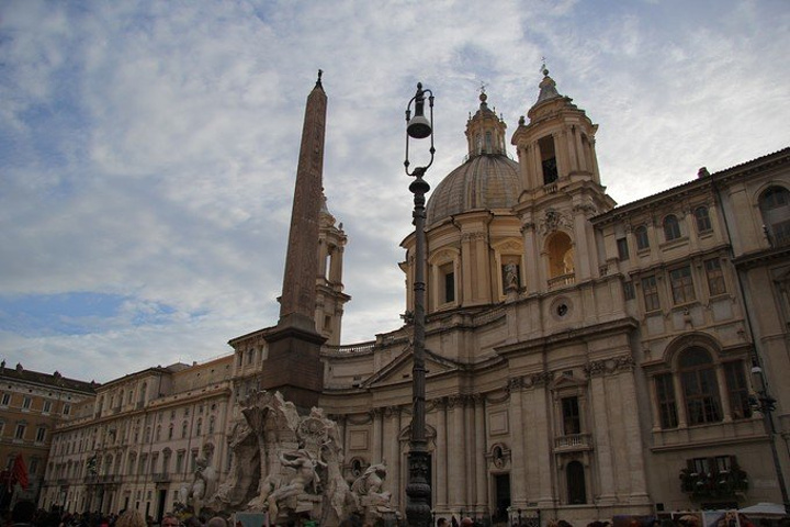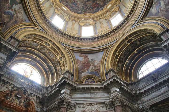 我和老婆进入了广场的圣艾格尼丝教堂,平面呈希腊十字,中庭为穹顶,整体风格喜庆热闹,为巴洛克装饰的典范,穹顶上绚烂舞动的绘画直升天国。由于全局节奏起伏的把握到位,也或许是由于顶比较低的原因,教堂的穹顶给人感觉比圣彼得大殿更撼动人,更易融入升腾的天国世界。