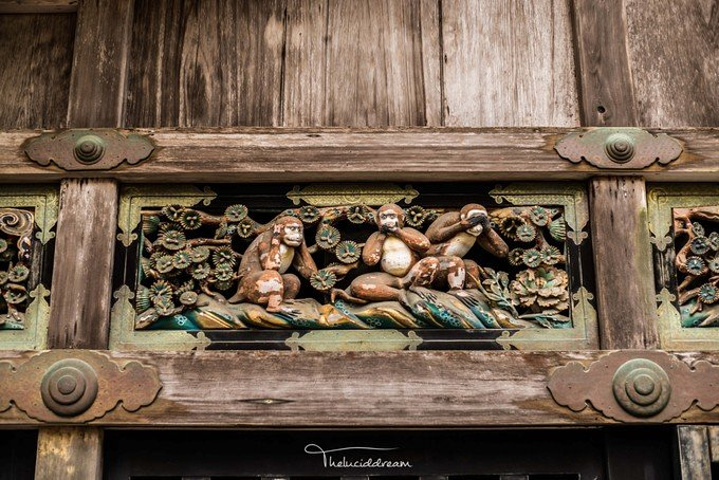 日光东照宫。建于1617年,是祭祀幕府大将军德川家康的灵庙。日光东照宫是全日本所有东照宫的总本社。日光宫内有相当多有趣的古建筑,包括入口处的五重塔;金碧辉煌、雕刻着500件以上动物、植物及神兽的阳明门;以及一座雕刻着各式猴子的马厩——其中最著名的即三只用爪子分别捂住眼睛、耳朵和口的猴子,取自《论语》中的“非礼勿视、非礼勿听、非礼勿言”。走过长长的参道,可以来到由神灵眠猫守护的德川家康的陵墓拜殿。 本社参拜费1300日元。加上宝物馆和日光东照宫美术馆的通票费用则为2600日元。