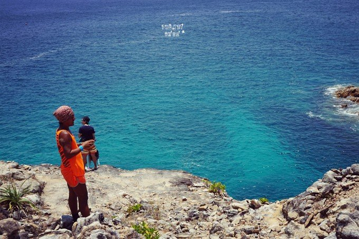 吃饱喝足,导游带我们上观景台,这时候正是最最晒的时候,所以上去之前,一定要穿上潜水袜,否则上去之后你的脚肯定会烫伤的!而且山路很多碎石子,并不好走。走到一半往下看,美美的!