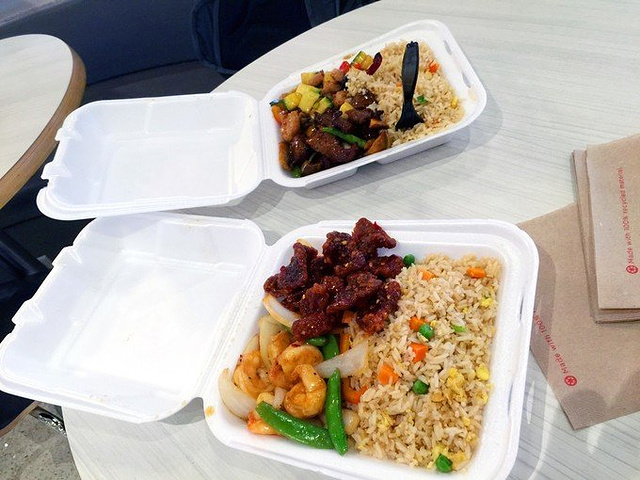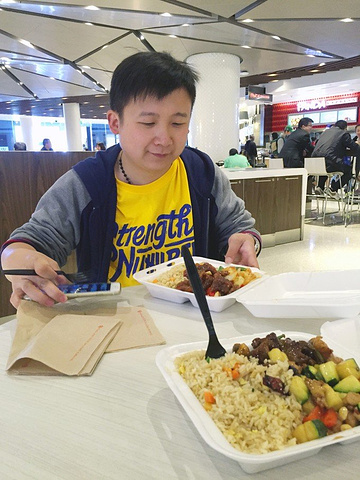 昨晚就把车还给还了。今天坐的酒店机场巴士来到洛杉矶,注意下车的时候如果你行李多,驾驶员是会帮你提的,但记住给小费。我是看见同行的老美掏钱给了才想起来要给小费。 AA的工作人员很热情,还问我们在洛杉矶玩的是否开心。这里托运的行李不是直接给柜台,而是要自己放到一个板的背面,会有专门人员检查。 洛杉矶的安检超严格,普通的就不说了,还需要脱鞋进一个像风淋室的房间。免税店不是很大,买的东西的话不能直接拿,凭小票在登机门等就行,会有转门的人员拉过来。 好不容易看到有中餐,叫panda,赶紧填饱肚子准备登机。 回程需要14个小时,比来时多了2个半小时,地球自转啊
