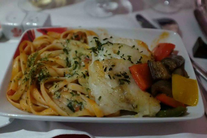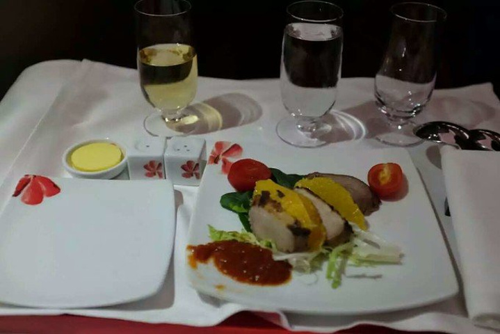晚上9:10飞机起飞。香港航空公务舱提供娇韵诗洗漱包,服务和菜品还是不错,就是感觉椅子有些窄,一路上我的被子掉了好几次。