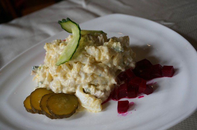 德国咸猪肘,腌过了,可真不是正宗的,不过,肉还算多。奶油土豆鸡肉沙拉 好吃