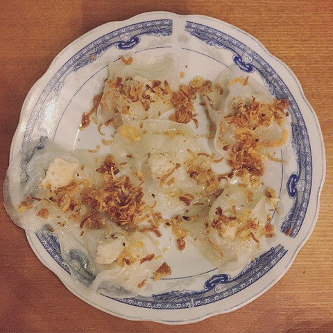 白玫瑰饼。只是长得像白玫瑰而已,其实是糯米皮包着海鲜,味道独特,很好吃。一定要沾他家的清油!60,000盾(约18元)一份。