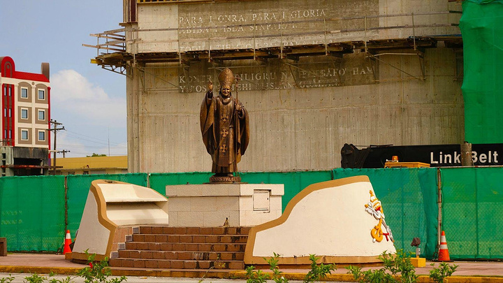 这是一位在关岛极具影响力的人物。为了满足南岛和北岛人民对他的崇敬,这座雕像是旋转的,以便让南北人民都能得到他的祝福。他是谁呢?他是教皇约翰保罗二世,他的铜像屹立在正在建设的关岛博物馆入口处。
