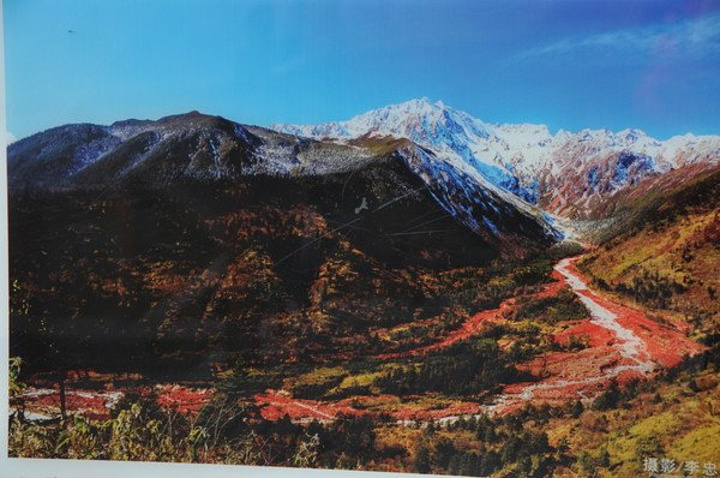 于是看到观景台上的宣传照片,马上拍下来,因为有玻璃,有点反光,但还是好漂亮呀。当天要是早点就能看到这样的风光,蓝天、雪山、红石、彩林,那是啥感觉呀。