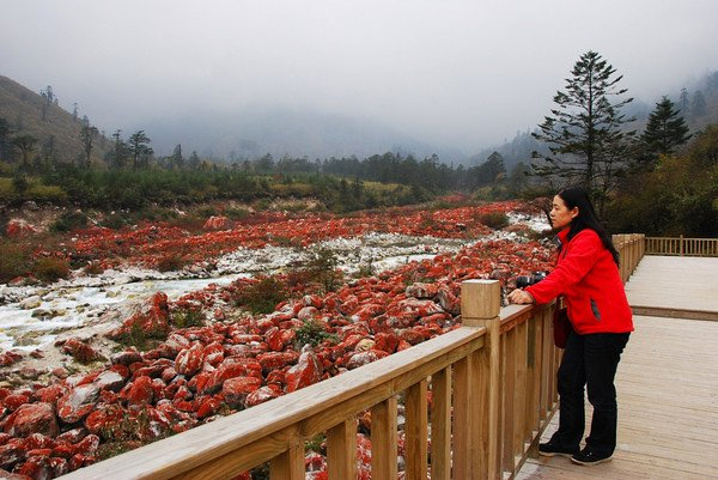 半山上终于看到了我们一直想看的红石滩,场面真是很壮观,石头真的很红很红,看傻了。 由孙俪,邓超领衔主演的《画壁》的外景地正是这雅家梗红石滩。