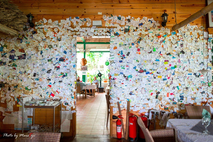 塞舌尔,有一家号称自己经营了百年的餐厅(Marie-Antoinette),这里提供着地道的克里奥餐,是当地最古老也是当地人亲友相聚的首选之地。非常傲娇的,餐厅多年来只有一份菜单,上面是一模一样的菜式,这意味着顾客不需要点菜,你吃到的是店家配好的,不能挑,只能吃,298卢比/份。如果你说顾客至上,凭什么没有选择的权利,有,你可以随心所欲点饮品和雪糕,或者,你可以选择不来。 餐厅的外观看起来和居民房没有什么差异,内部却藏有乾坤。除了特色的装潢摆设外,还有满满一面墙的留言,全都是顾客们留下的,云集了世界各地的语言和文字。往餐厅深处走,有一个迷你版象龟园,养了7只龟,貌似当地人把象龟当成了福星,走哪儿哪儿有。 谈过了店面,来说说食物吧。 在路上,就听司机大哥说过,蝙蝠是克里奥餐的特色菜品。看他说起来满脸陶醉的样子,严重激发了我们的好奇心,强烈要求要见识一下它的庐山真面目。司机大哥便把我们带到了这里,因为这里有一道“暗黑料理”界的翘楚菜式——咖喱蝙蝠。咖喱蝙蝠选用的不是我们常见在夜间飞行的蝙蝠,而是果蝠。这种蝙蝠的体型要比普通的蝙蝠大很多,所以肉也比较多,是作为烹饪食材的首选。从“卖相”来看,这道菜绝对是一道暗黑料理!黑乎乎一团让人分辨不出是什么肉,如果不告诉你这道菜是咖喱蝙蝠,很多人会以为是一道失败的咖喱鸡之类的。说到味道嘛,这种蝙蝠肉质紧实,吃起来很有嚼劲儿,不知道是不是因为咖喱味道浓重的原因,并没有觉得蝙蝠肉有什么奇怪的味道。比起前一天在凯宾斯基吃的黑暗自助餐,百年餐厅的出品已经算得上是人吃的东西了。难怪所有来中国的外国人都能被随便一道中国小吃给迷住。