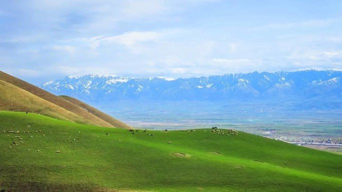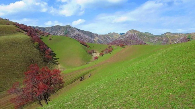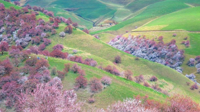 牧草探出小小的头,骏马牛羊遍地,麦草垛如小山般地对外草原小别墅一样的哈萨克民居旁。那拉提这边忽然乌云密布,向西50公里的吐尔根乡却是无比晴朗的蓝天白云,光滑凸起的山体,遍布着数万公顷的野生杏花,随手一拍都比window的桌面屏保更美
