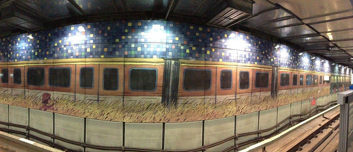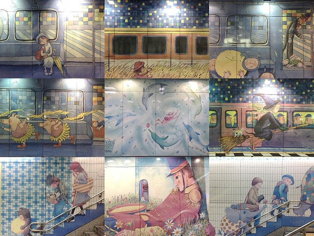 如果你中意几米的漫画,去台北就一定要探访一下布满几米画作的地铁站——南港地铁站。作为台北最美的地铁站,映入眼帘的不是司空见惯的广告灯箱,而是用马赛克拼出的一幅幅几米《地下铁》、《向左转,向右走》、《月亮忘记了》中的经典画面,图画遍布地铁站站厅、站台同各个出入口通道。