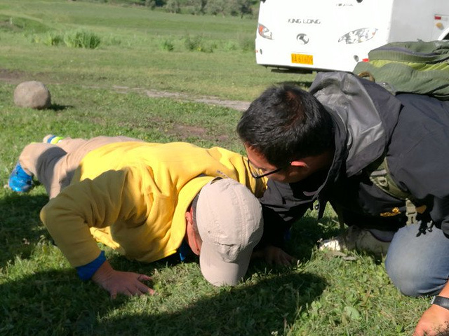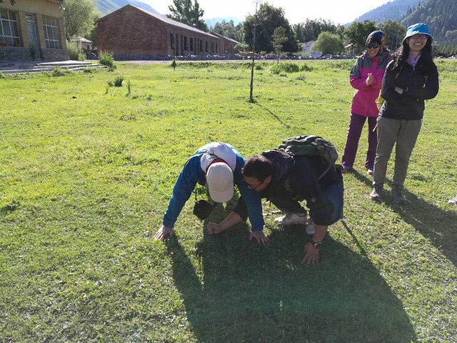 早餐后,小苏带我们做游戏,规则就是输者要表演节目,唱歌、讲笑话、俯卧撑等均可以....... 马强的俯卧撑还是很标准的.