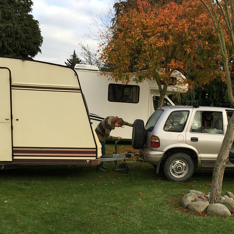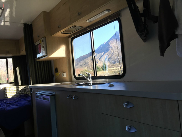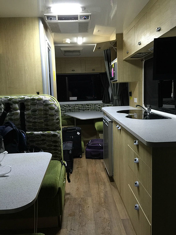房车里的设备很齐全的,厕所,电源插座,微波炉,一米高的冰箱,灶台水池(在水龙头下方用两个黑色的板盖着)。我们买的菜,油盐酱醋都放在柜子里面。车上还有暖气,用两个小燃气罐供暖。