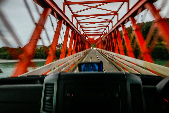 这座桥非常特别,因为这是公路和铁路共用一个车道的一座桥。看到铁轨了吗?