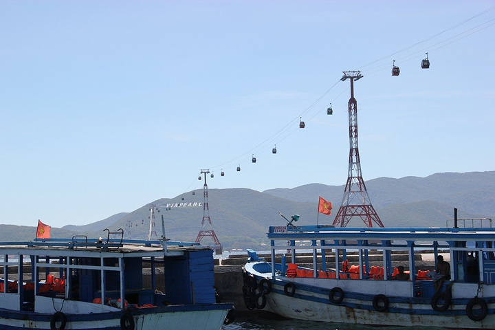 码头上都是这样的小渔船,每天走着相同的线路,玩着相同的游戏,却让游客们感受到各自不同的快乐体验。 高高的跨海索道,连接着码头和珍珠岛,高耸的索缆和圆圆的轿箱在蓝天白云下,又是一道独特的风景。