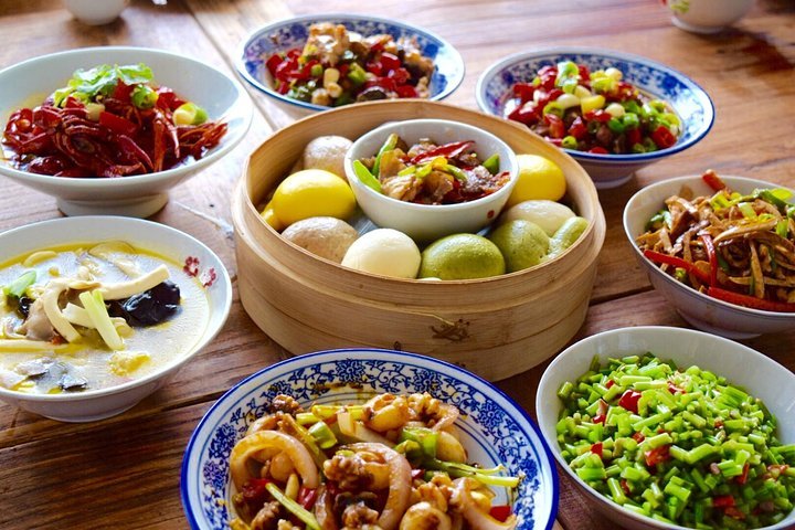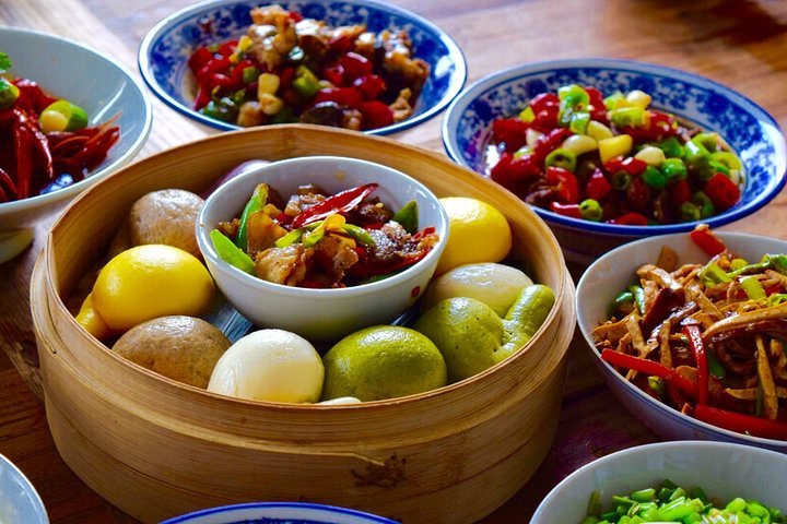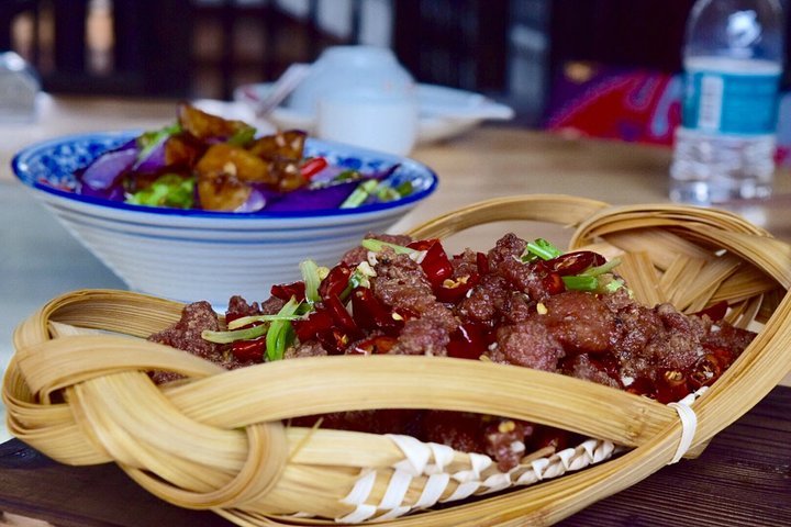 这就是我们三顿正餐的餐厅,店铺装修古色古香,虽然没有那么精致的装修,却从跨入大门的那一刻,中式的大堂,朴素的大木桌,一边放两个凳子,一个桌子坐八个人,大家坐在一起吃饭,一下就仿佛回到了那个时代,我们的菜应该是提前备下的,所以上菜的速度还是蛮快的,做为一个专业吃货,负责任的告诉大家,卖相还是不错的,店家应该挺讲究卖相的,所用食材上菜的时候,配合的都相当精致,让人看了就比较有食欲,那边菜系的风格重油重色,味道也还行,原谅我拍的比较少,因为美食当前,实在抵御不了诱惑,所以他们拍拍拍,我就吃吃吃了(可怜脸)。