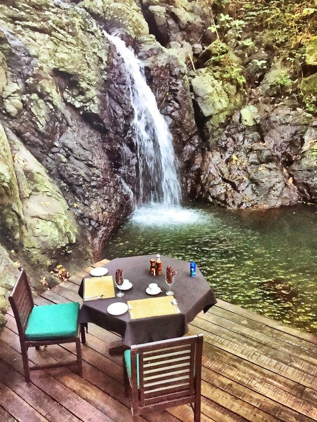 到达后已经有服务员在布置了,这是天然的瀑布,其实上游比较长,下面有一个小水塘,吃完早餐可以游泳哦~而这些都是Namale Resort独有的,并且整个瀑布区域也是他们的空间哦~!