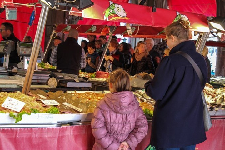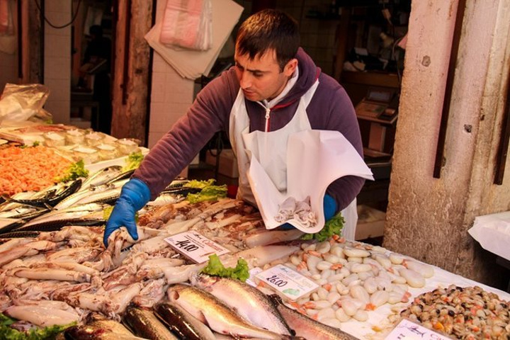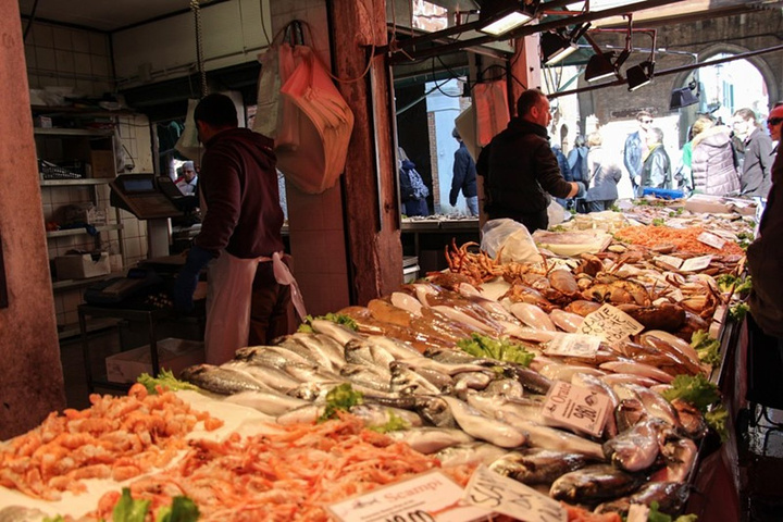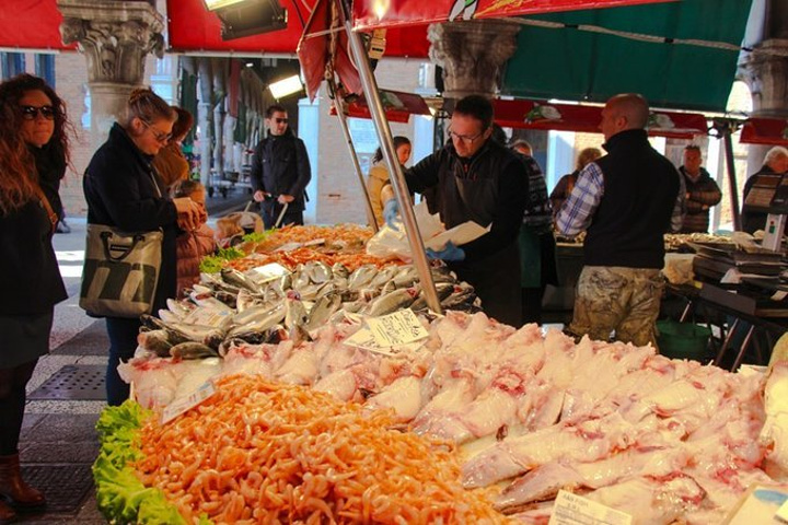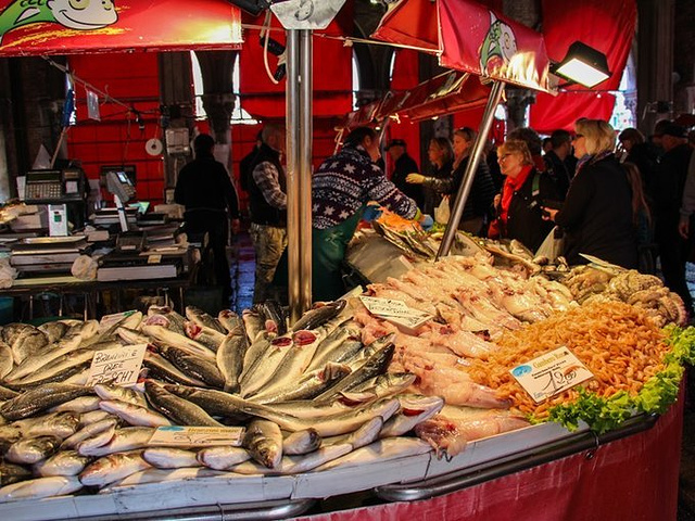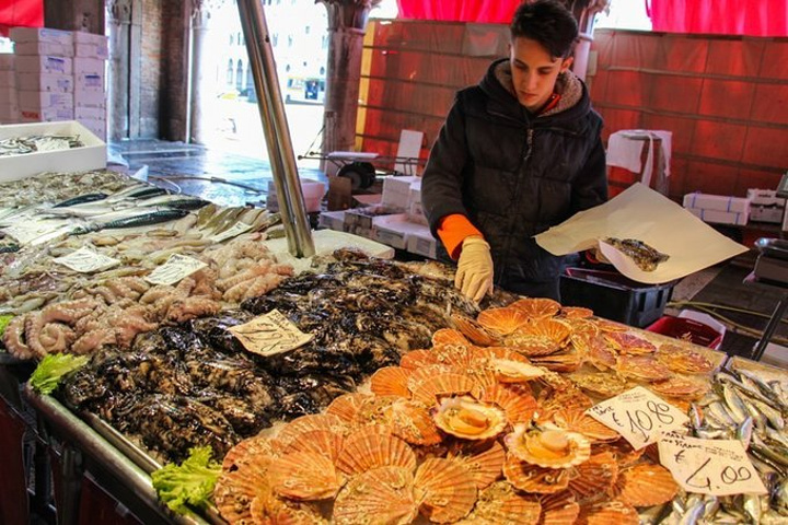 意大利像一只长靴,深入地中海,两侧的海岸线很长,也意味着意大利有丰富的海洋资源,海产品定是不会少的。 威尼斯的上一个目的地,五渔村也是临海,我们在五渔村海边的观景餐厅里吃到了内容丰富的海鲜饭,以夕阳与葡萄酒佐餐,幸福感爆棚。再之前在罗马半夜回酒店前,我们饥肠辘辘,在街角的餐厅打包了餐厅最贵的一款意面:海鲜意面。看上去白白的面条好像没有什么味道,但吃在嘴里满口的海洋味儿,那应该是青口和蛤蜊炒制中流出的汁水的鲜味。每一口要么吃到虾要么吃到鱿鱼,真是喜出望外。在意大利才知道,原来新鲜的鱿鱼是有韧劲儿的,与我们平时在国内吃到的口感很不同。在威尼斯我们会遇到怎样的餐厅何等的美食呢?抵达之前我可是一点谱也没有,因为威尼斯的行程全程交给了另外一只。还好还好,另外一只也是个吃货,在面对海鲜的态度上与我极其一致。对食物的追求让这位先生划定了一处除了前几篇介绍的威尼斯大众旅游景点外的威尼斯鱼市。果不其然,在这里,我们收获满满。 鱼市位于里亚尔托桥附近,挨着威尼斯最古老的教堂:圣阿波斯托尔教堂(Church of San Giacomo Apostolo)。这座教堂身居窄巷,毫不起眼,但是来历非同寻常。教堂建于中世纪,与威尼斯全盛期的文艺复兴、巴洛克风格截然不同。虽然外表古朴,但是路过门前的小广场,却不由自主的被他吸引。一般威尼斯人叫这个教堂为“Giacometto”,教堂和门前的小广场靠着大运河,周围有威尼斯最大的鱼市和菜场,好不热闹。这里是威尼斯的中心,却很平民化。有些破败,墙上有涂鸦,走来走去的人很杂。 人一杂,市场就显得有点乱,但是却也很有生活气息。威尼斯鱼市是一个1907年修建而成的室内市场,不过早在600年前,鱼贩们就已经在这里卖泻湖出产的鱼虾了。现如今,鱼市主要出售泻湖虾、扇贝、墨鱼、剑鱼等新鲜水产品。上午来这里,正是鱼档上水产品最新鲜的时候。大虾、墨鱼、扇贝,有当地人叫做“sgombro”的小请与,叫做“spada”的剑鱼,鲳鱼、石斑也很多。威尼斯最出名的墨鱼汁面条,就用这里最新鲜的墨鱼作原料。鱼市外围是里亚尔托市场,这个市场大部分是卖蔬菜、水果的摊位,但边上也有一些是卖水产品的。 如果想了解当地人的生活,喜欢的水产,和如何挑选水产,那可要早点起床。早上六点钟左右,摊主就陆续开始收货和整理摊位,7点来钟断断续续有本地顾客光临。