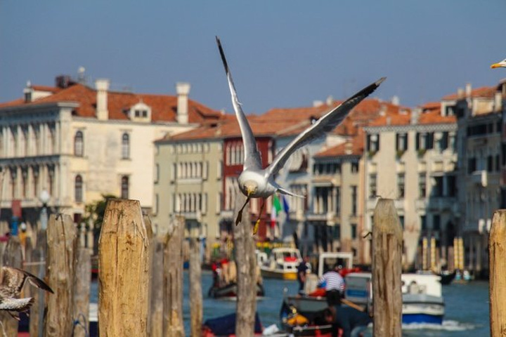 威尼斯岛的鸟类非常多,尤其是我喜欢的大海鸥随处可见。在圣马可广场也只能是撒欢喂喂鸽子,大海鸥才不屑于吃鸽子食儿呢。在鱼市周围,海鸥数量很多,胆子大的海鸥还会从二层楼高的地方滑翔下来,贴着行人头皮飞行,落到鱼贩丢弃的鱼杂碎篮子里偷吃。鱼市有专用的码头,码头上的海鸥跟馋荤腥的猫咪一样,守着运鲜鱼的船,吃不到嘴也要盯着看。