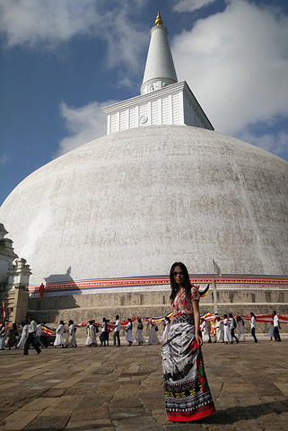 鲁梵维利萨亚佛塔(Ruwanwelisaya Stupa)是古城里修缮最完好也最有生命力的佛塔。就在菩提寺旁 边,这座舍利塔建造于公元前2世纪,公认是由杜图伽摩尼国王建造的最美的 建筑物,据说刚完工的时候有110米,但是现在只有55米高。这个佛塔我们在自拍时,一个 工作人员过来阻止我们,原来跟佛塔合影,不能夫妻两人一起拍,不知道原因。