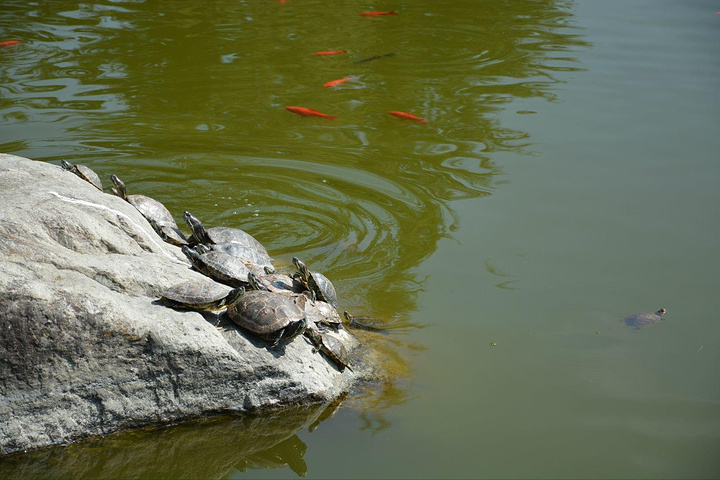 门口门票是120元。小湖里,好多乌龟都爬上来晒太阳而且把脖子高高抬起,这是“原理”吗