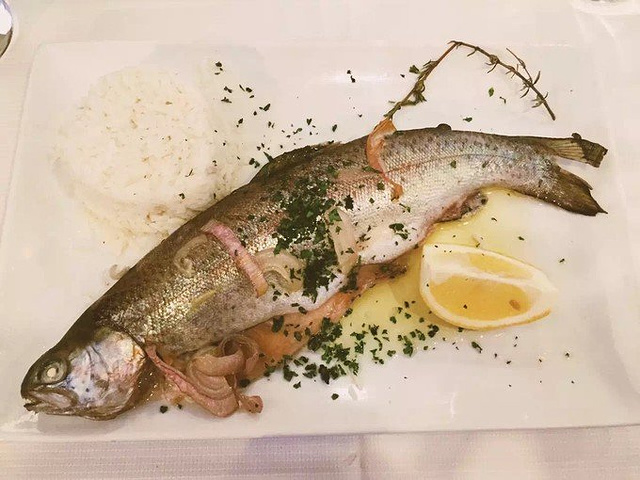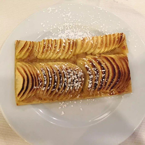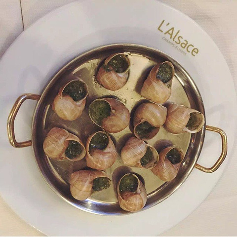 从老佛爷出来后,赴约晚饭。晚饭就随便找了一家店吃的,没有定位,名字应该就是盘子上那个LAlsace。3 courses 20几欧那种。 蜗牛+考鳟鱼+苹果派。说一句,法式苹果派真的很好吃。比那种英国经常看见的tart好吃100倍。 新鲜苹果切片,水果的清香加上肉桂粉的味道,下面的酥皮又酥又甜,回味无穷啊。