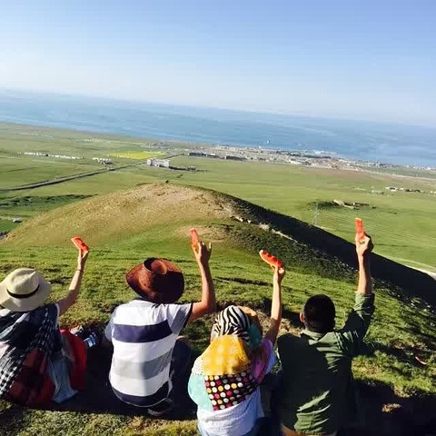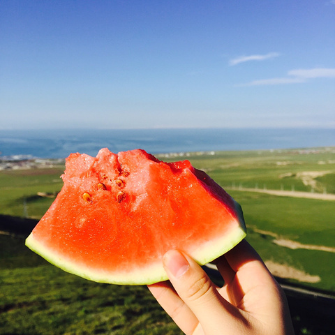 马师傅带我们去了一个山顶 可以俯视青海湖 此时 西瓜和美景很配哦 哈哈 马师傅想的很周到 吃个...