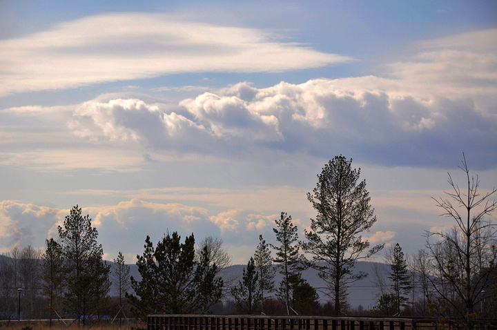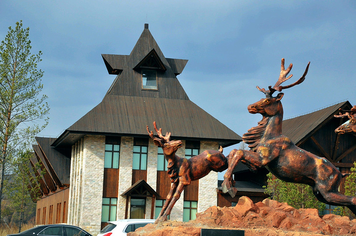10月3日早晨,依旧是一个大晴天,我怎么也睡不着了,第一个起来在周围转了一圈,气温不像想象的冷,确定了吃早饭的地方后回旅馆招呼大家。早上9:00,我们退房吃饭,再次踏上了一路向北的旅程…… 张大哥带我们首先来到了敖鲁古雅鄂温克族驯鹿文化博物馆。“敖鲁古雅”是地名,鄂温克语,意为“杨树林茂盛的地方”;“鄂温克”是我国的少数民族之一,意为“住在大山林中的人们”。他们藏于大兴安岭林区的林海雪原之中,坚守着最原始的狩猎方式,与驯鹿为伴,被称为中国最后的“狩猎部落”,是中国唯一饲养驯鹿的民族。 这里场地空旷,一座座折页屋顶的木头房子很有特色,一组向前奔跑的驯鹿群雕下镌刻着:“中国驯鹿之乡”,在蓝天白云的衬托下动感十足。这个季节几乎没什么游客,我们也没有进博物馆去看,好奇地在仅有几家仍在营业的商铺里转着看着。我对鹿角、树皮等用当地特产做成的工艺品很感兴趣;天晨却被商铺外几条懒散地眯着眼睛打着盹的狗狗吸引了眼球;媳妇对动物皮毛作成的服饰情有独钟,把看中的一顶外翻狐狸毛的帽子戴在了天晨头上,哇塞!那种林海雪原的感觉顿时出现在眼前;小薛也是看看这里,摸摸那里,还不时地问问价格;由于物品超出了我们的心理价位,最终只买了两瓶蓝莓汁饮料就此作别。