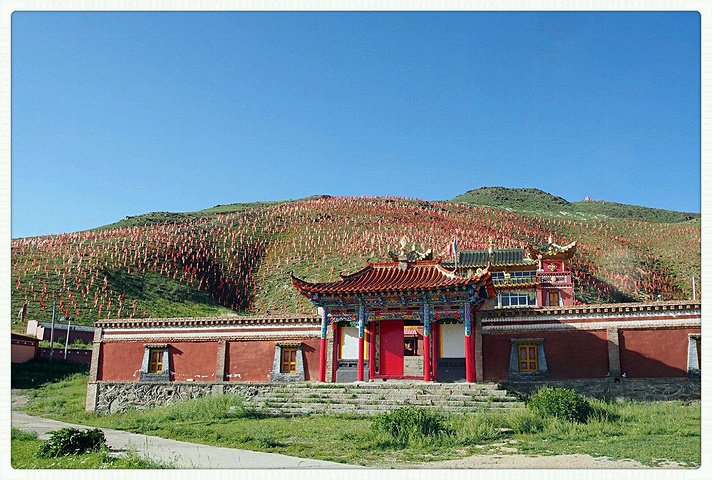 沙陀寺正门,后面山坡上遍置风马旗,十分壮观。司机在我游览时,在庙里磕长头。
