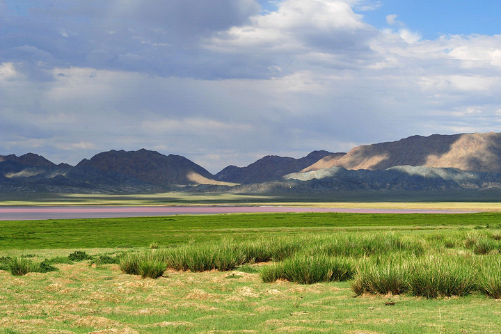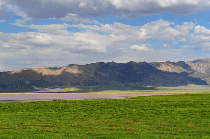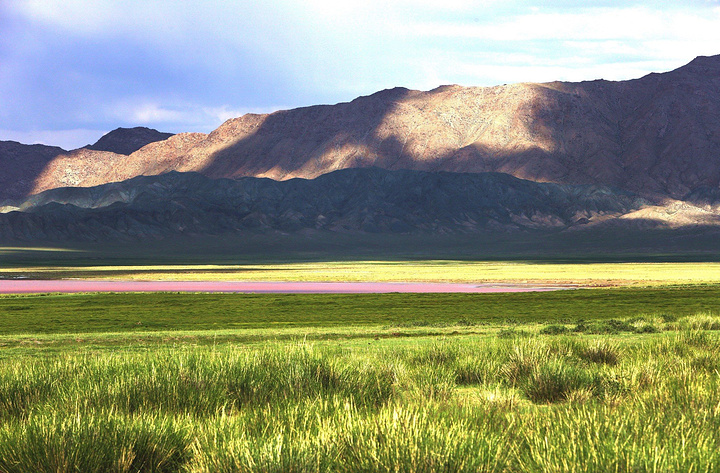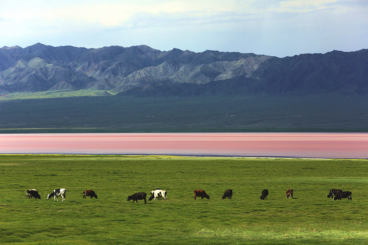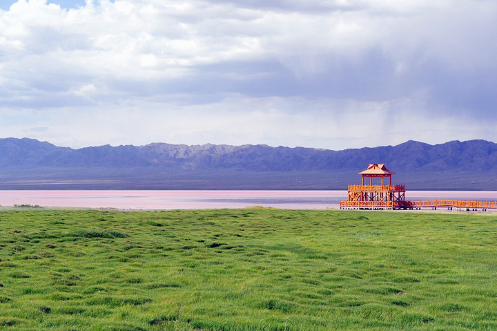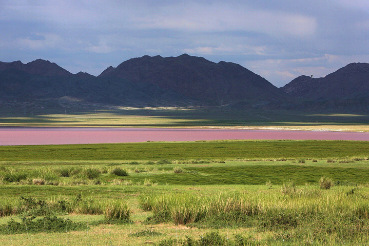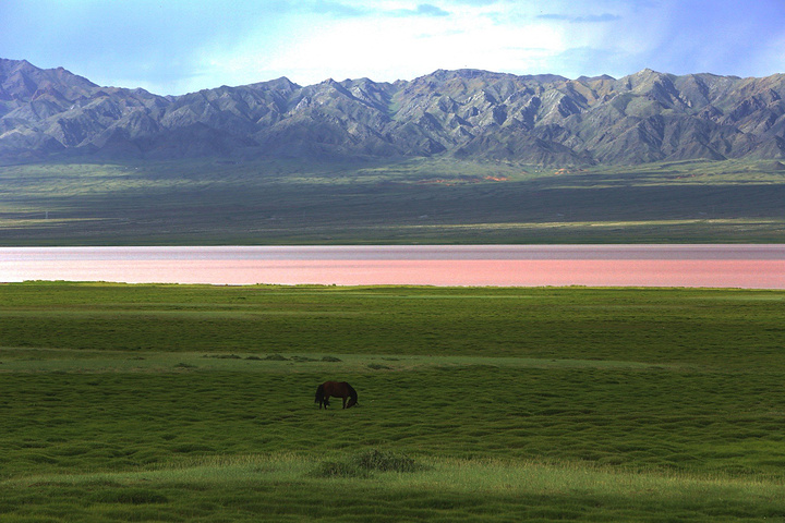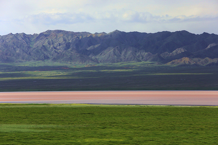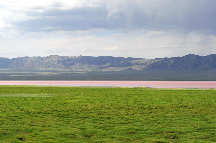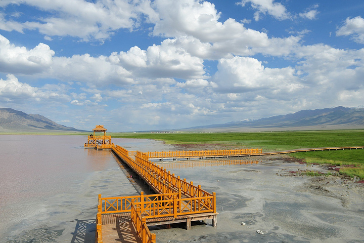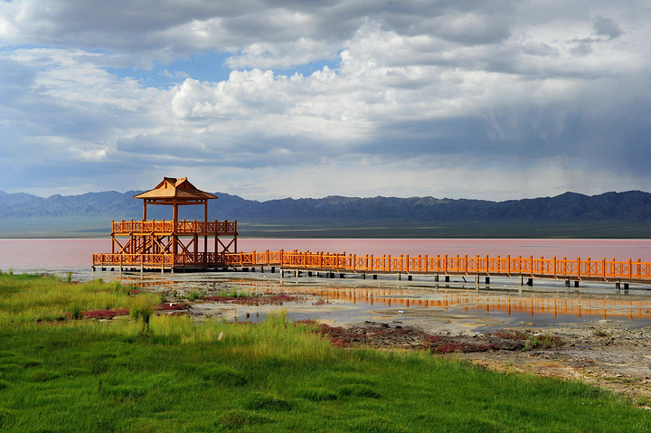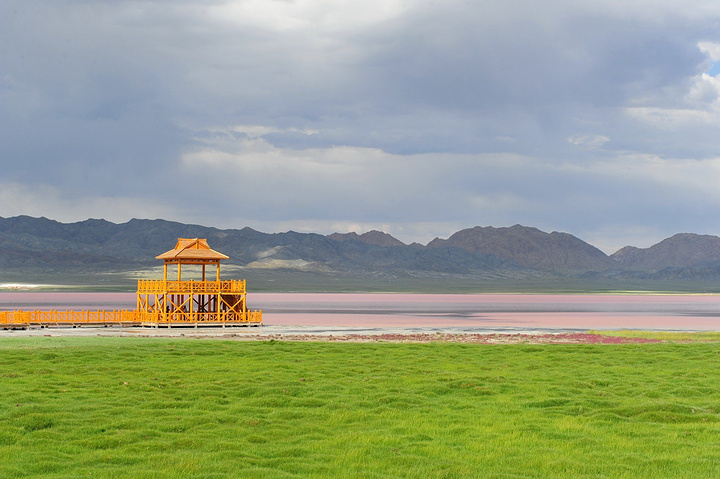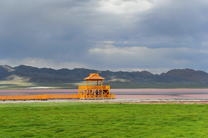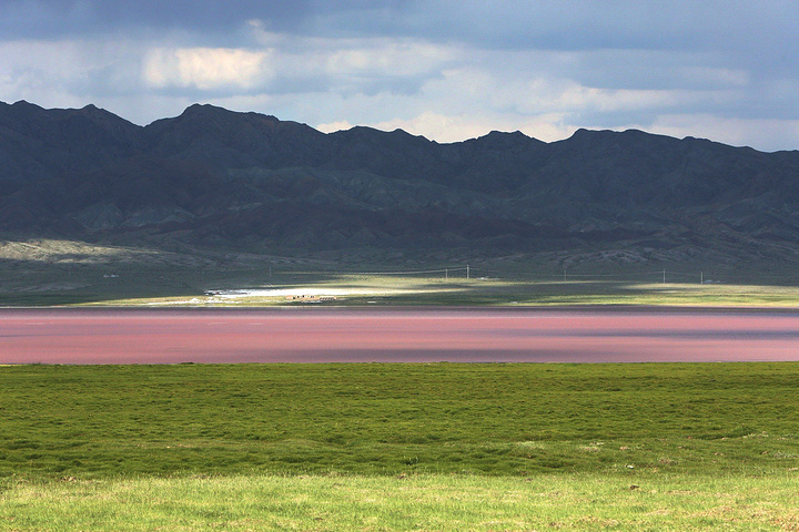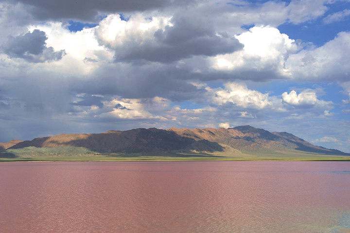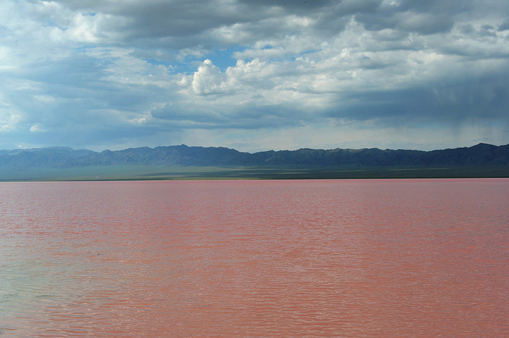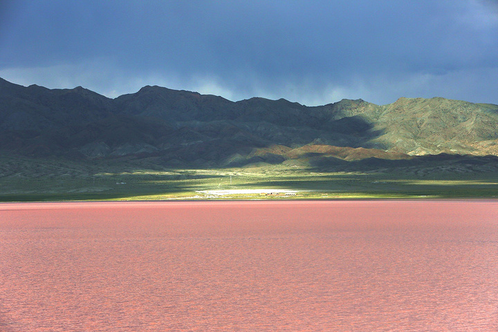看到路边有一个幻彩湖的路牌指示,离公路只有3公里,上次是夜里走过这里没有看到。到达幻彩湖,一条栈道直达湖边,湖面呈现出粉红色,光怪陆离的幻彩感觉名副其实。先长焦拍几张。