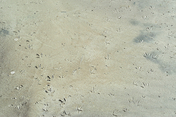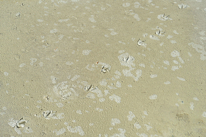 来到湖岸边,湖岸泥地上有很多大型禽类的脚印