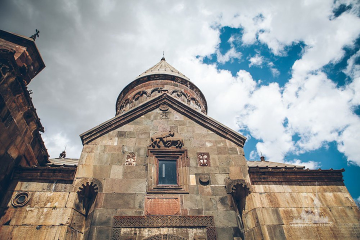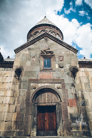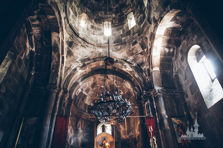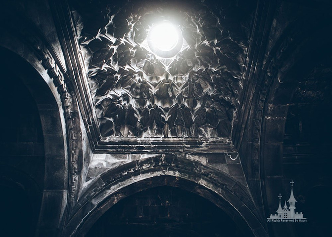 和很多修道院一样,Geghard的内部也是光线昏暗的,只是抬头看天窗旁边的雕刻却很考究和精美。
